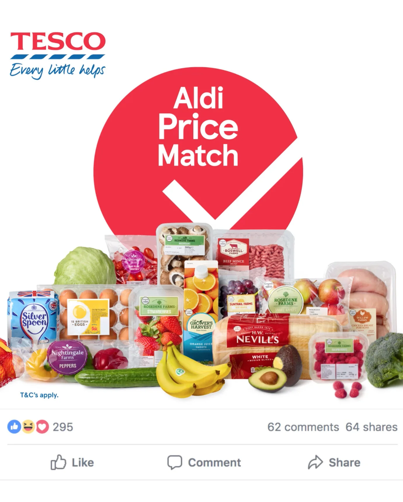 Tesco’s position as the home of great value has been undermined by other supermarkets, and Aldi in particular. With the economic uncertainty bought on by COViD 19, shoppers are looking for great value staples, from a name they can trust. Using simple animation, both In TV and social, we demonstrated how across a wide range of products, you won’t pay more at Tesco than at Aldi. Agency: BBH